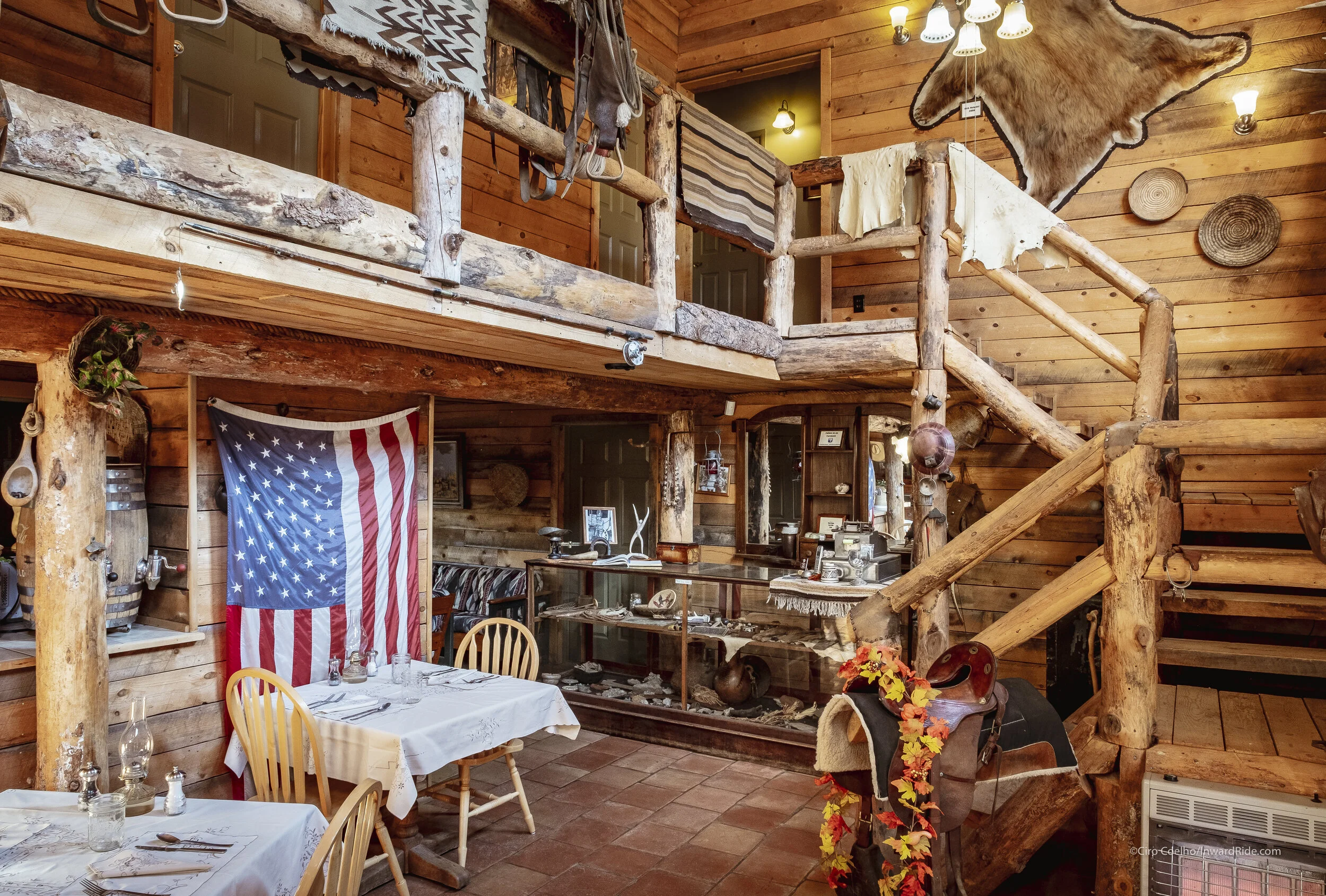Inside the saloon, protected from the cold front that brought below-freezing temperatures to Utah, I am shielded from the weather, and embraced by the textures of the Western Lifestyle of old. The rough-cut lumber of the walls, the unmilled round log beams and railings, the saddles, antlers and large elk trophies, smoothly usher the exterior ranch experience into the interior of the saloon. Restaurant tables, with embroidered linen cloths and napkins, kerosene lamps atop, add to the refinement and the delight of my old west historic episode.